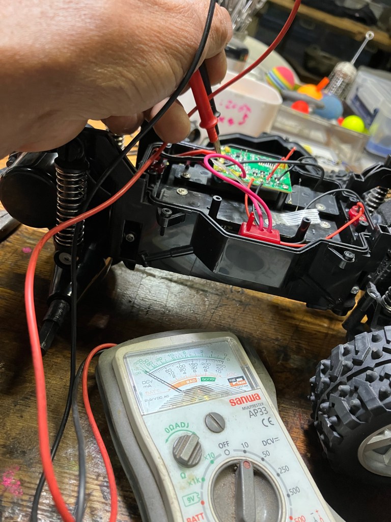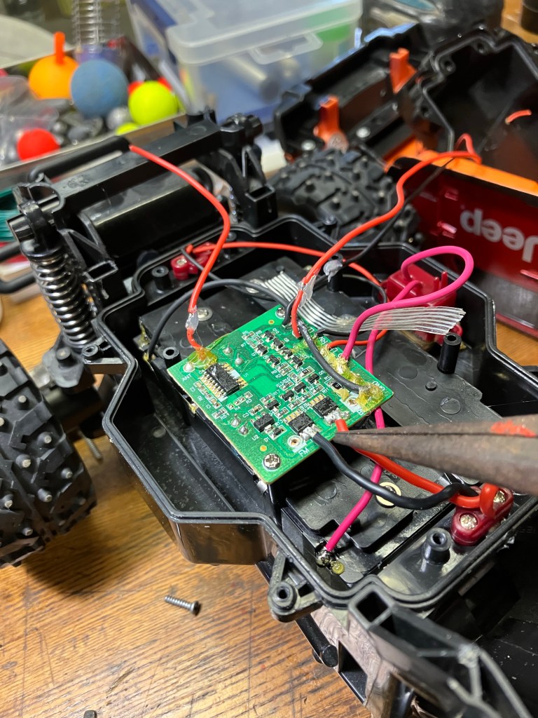 何とこれを配線し直したら、前後共高速運転し始めました。確かに前輪の舵はオンオフ送信ですが、走行はアナログ信号でスピード調整してるので、送信機の不良もあり得る。ですね。