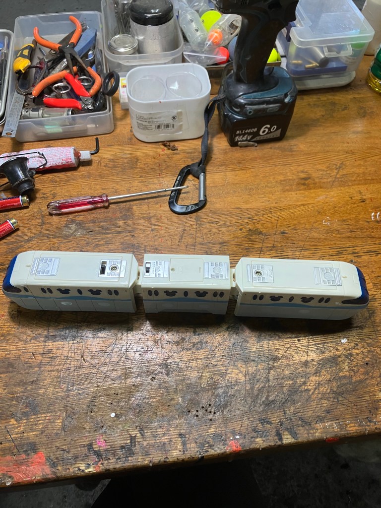 一般のプラレールはよく治しましたが、モノレールは初めてです。内部機構は殆ど同じでした。2台の依頼ですが、一台は部品取りに使って良いそうです。本命から修理スタートします。