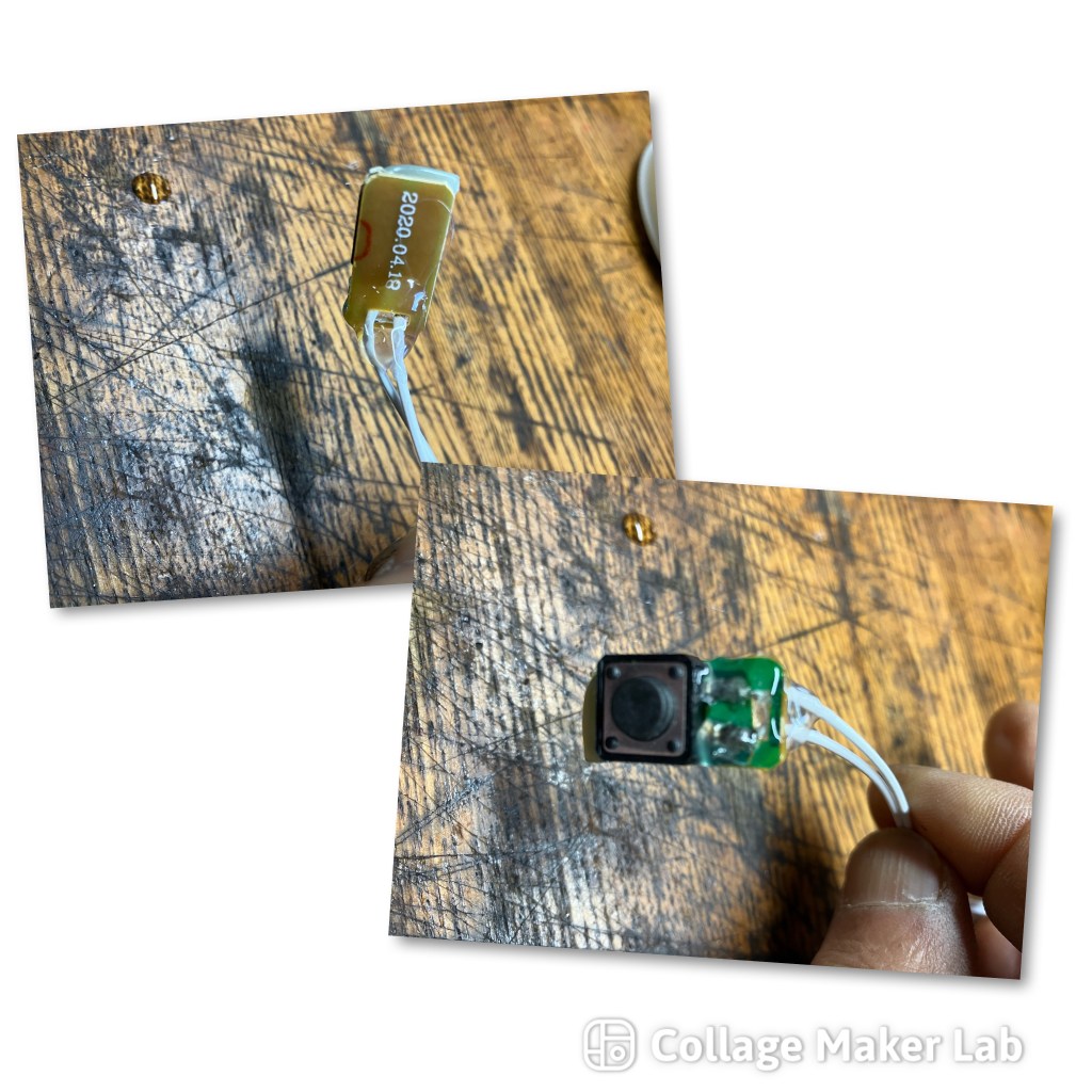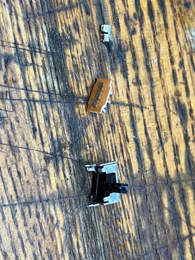 アンパンマン言葉図鑑、時々電源が入らないと言う事で、電源スイッチを分解して見ました。やはり接点が焼けていました。兎に角小さくて、部品を無くさない様に神経使います。何とか磨いてしっかりスイッチが入る様になりました。アンパンマン人形は腕に着いてるスイッチの線がきれてましたあ。良く触る所なので、ハンダ付けの後シッカリグルーで固めました。