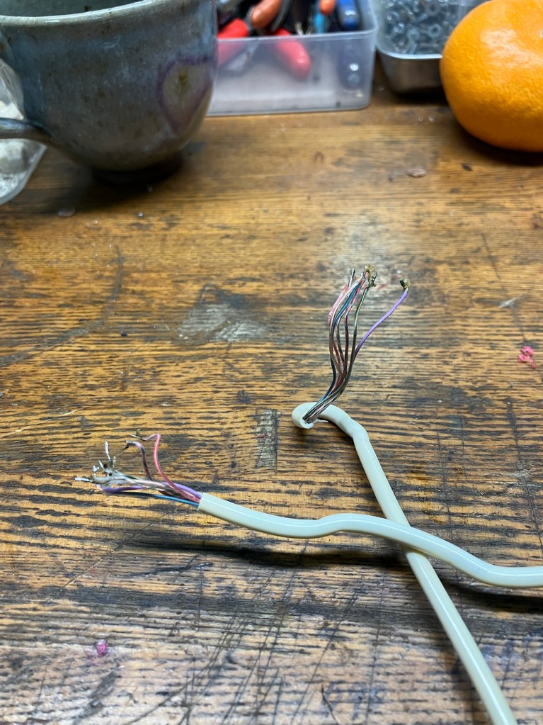 最近良く受けます。マウスのケーブルの断線ですが、コードが細いので内部の断線箇所が特定できません。ケーブルを交換するしかありません。初めての部品調達なので、適当なケーブルを探すのに苦労しました。今回のケーブルは少し硬過ぎたです、