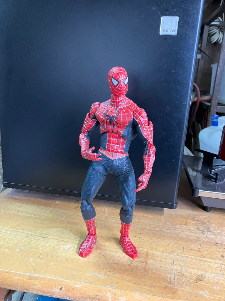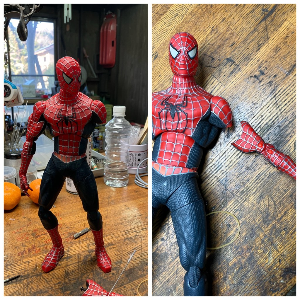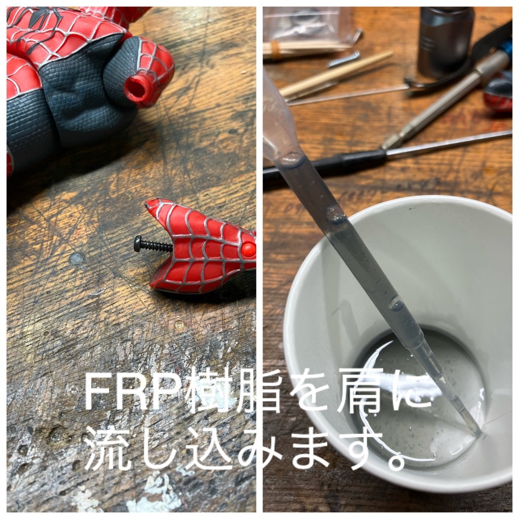 カッコいいフィギュアですが、腕が折れました。『弟が投げて折れた』良くある話です。接着剤では着かないので何とかねじ止め出来ないか。肩に樹脂を流し込んで固めてそこに穴を開けてねじ止めする事にしました。