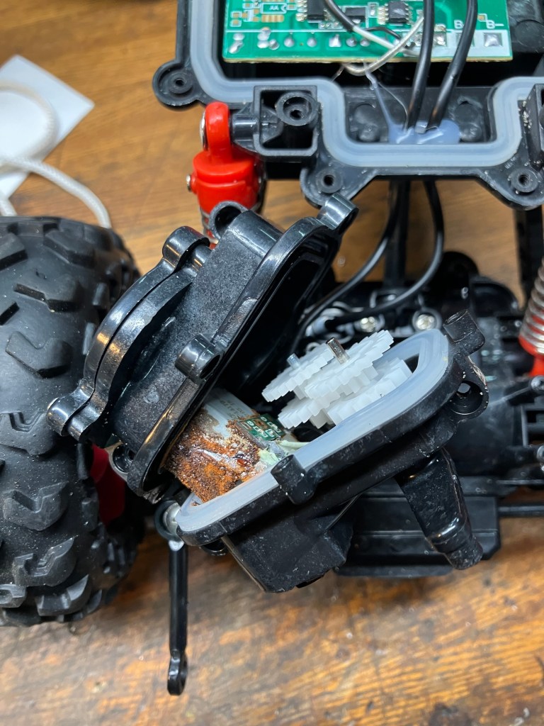 前輪、後輪駆動の高性能ラジコンです。水没したとの事ですが送信機も本体も動かないとの事。送信機は電池の容量不足でした。本体は前輪後輪舵取りモーター全て不良でした。2個のモーターは手動で動かしたら稼働する様になりましたが、前輪駆動モーターは分解して整流子も磨いて動く様になりました。