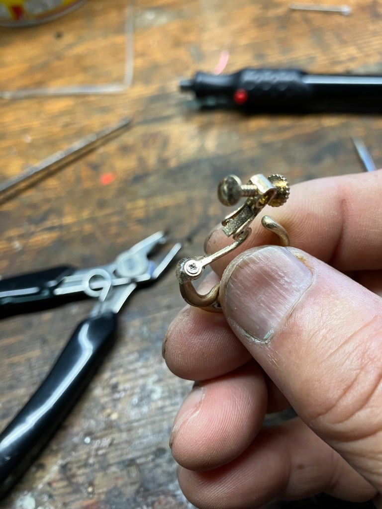 元、鐵工所おじさんにイヤリングの修理依頼です。そんな小さい事出来るでしょうか?今までで1番小さい仕事です。意匠的に失敗と思ってお返ししましたら何と使って頂けるとの事、嬉しいです。