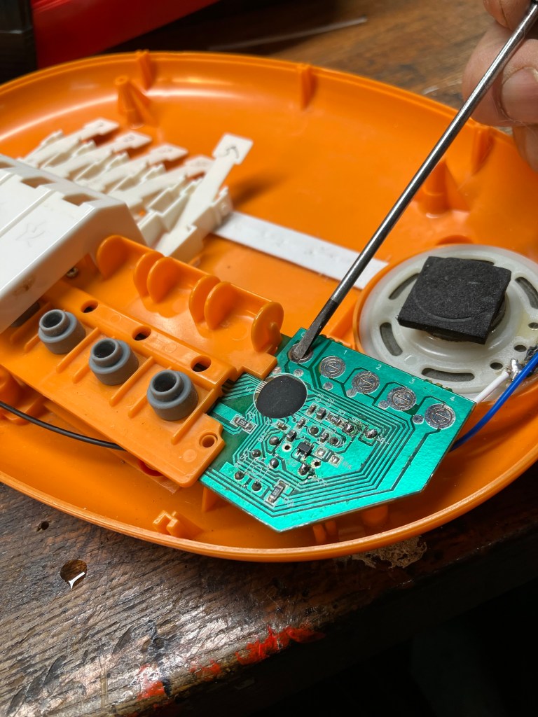 オモチャ病院で治らず、持ち込まれました。火で🔥炙ったそうです。これは疑問です。調べたらやはりIC回路が不良で基盤交換しか方法が有りません。部品取りを中古で買って付け替えました。